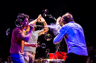 Cuuuuuuuudowne!!!! Przede wszystkim naprawdę zabawne, śmialiśmy się prawie przez całe przedstawienie :). Trupa cyrkowa składająca się z 4 śmiesznych kolesi. Każdy ma przynajmniej jedno solo, a poza tym wszystko jest połączone w spójną całość. Pierwsze solo - to taniec latawców skonstruowanych z przeźroczystego plastiku i żonglerka, drugie to taniec na linie, trzecie - diabolo i magiczne bańki mydlane, czwarte - monocykl i podniebny spacer do góry nogami.